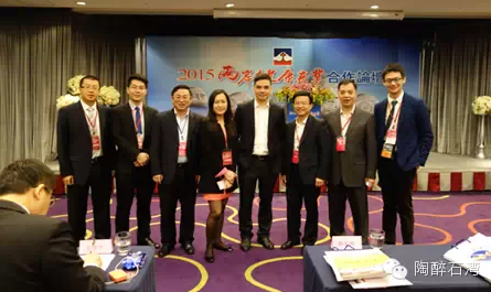 石湾镇街道办事处副主任、经济和科技促进局局长杨涛(右一)参加2015两岸健康产业合作论坛,给石湾健康产业发展带来新思路。